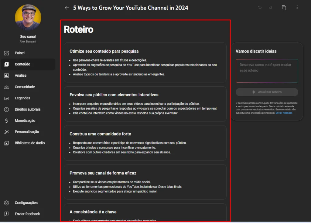 Uma dica extra: você pode combinar a funcionalidade da Aba Inspiração com o ChatGPT para criar roteiros ainda mais detalhados. Basta copiar a ideia gerada pela ferramenta e usar um comando específico no ChatGPT para expandir o roteiro, adaptar o tom ou até criar chamadas para ação.